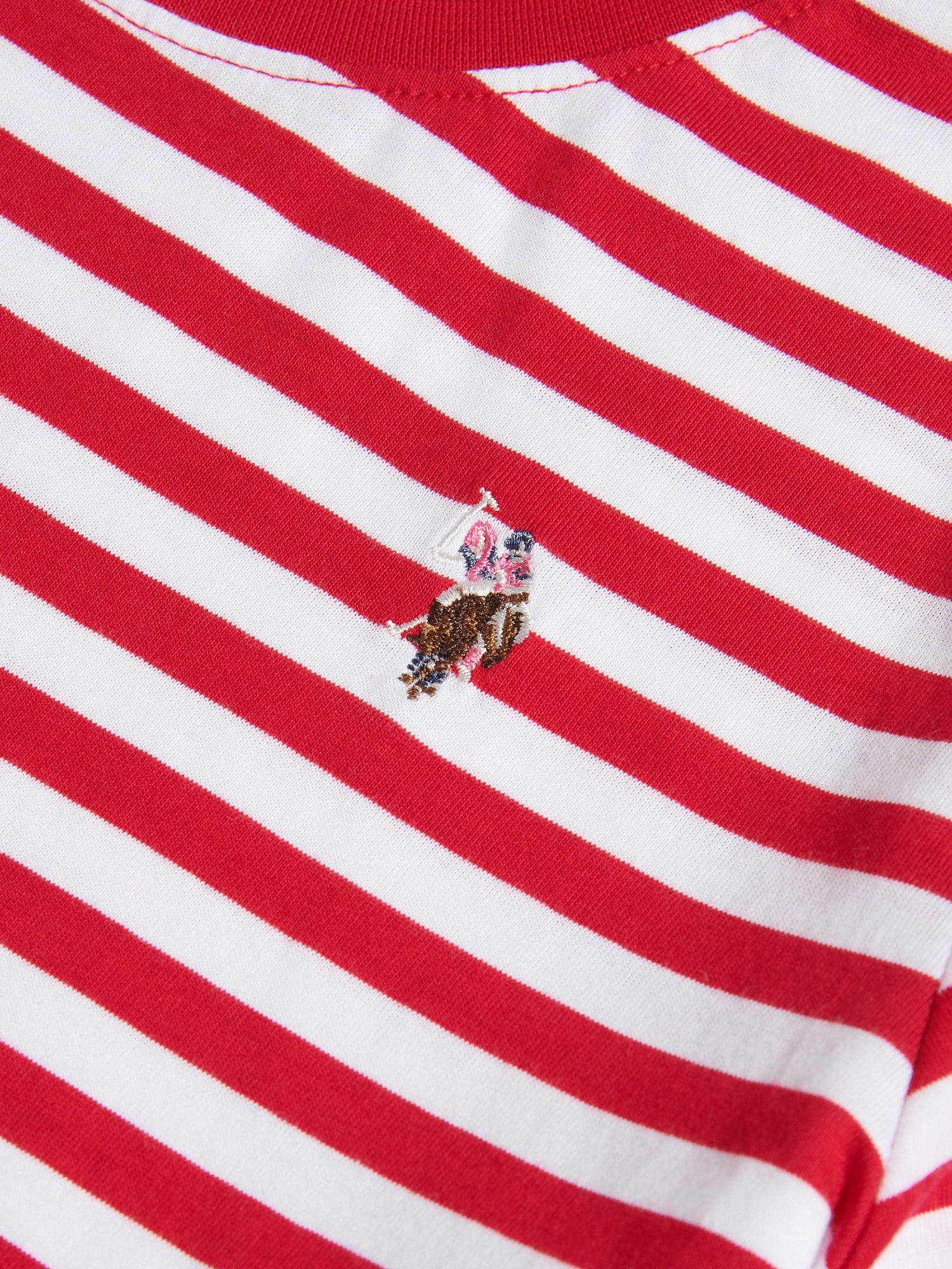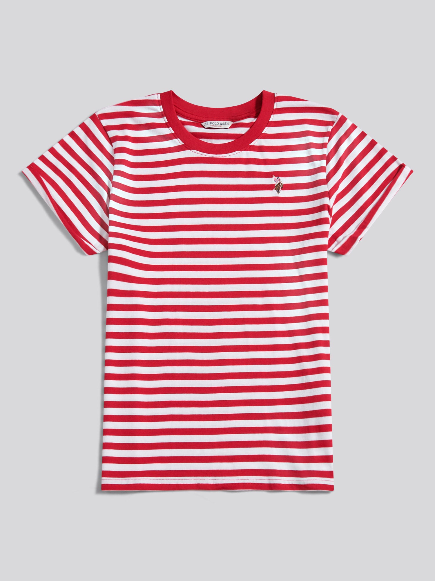 The U.S. Polo Assn. Womens Stripe Crew Neck T-Shirt brings a touch of casual elegance to any wardrobe, with a classic stripe pattern and a relaxed fit that feels as good as it looks. Perfect for layering or wearing solo, this tee effortlessly complements jeans, shorts, or a casual skirt for a refined yet laid-back look.